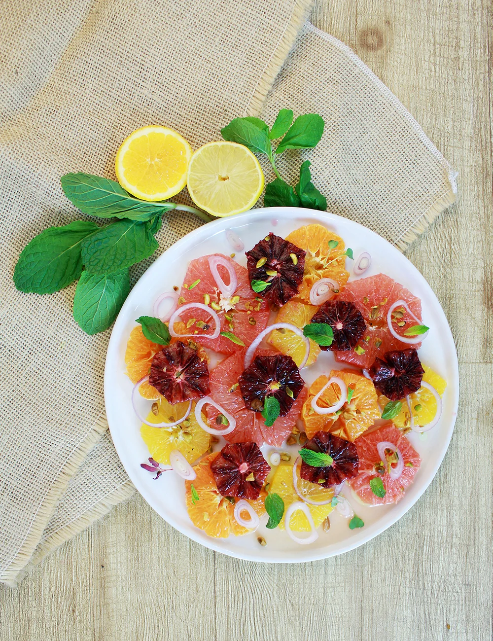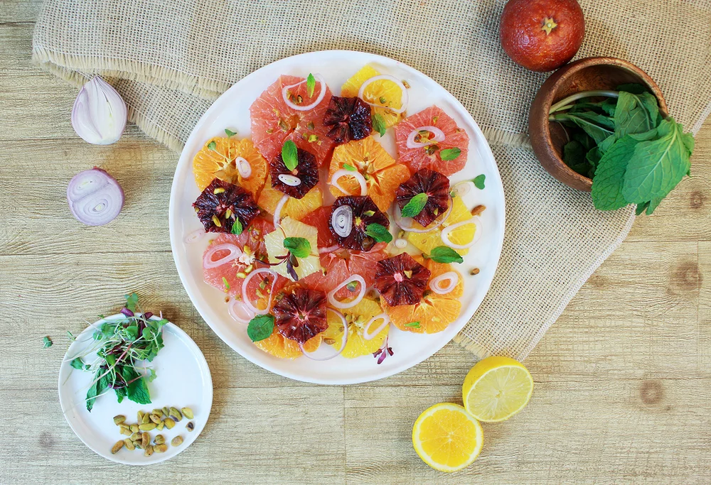 2. First cut the citrus fruits in slices, and then cut the ends to create hexagonal shapes. Layer the hexagons onto a plate and alternate the different fruit types so that the colors are random. Then layer thin slices of shallots, and top with micro-greens and crushed pistachios. Lastly, drizzle the dressing, and serve.