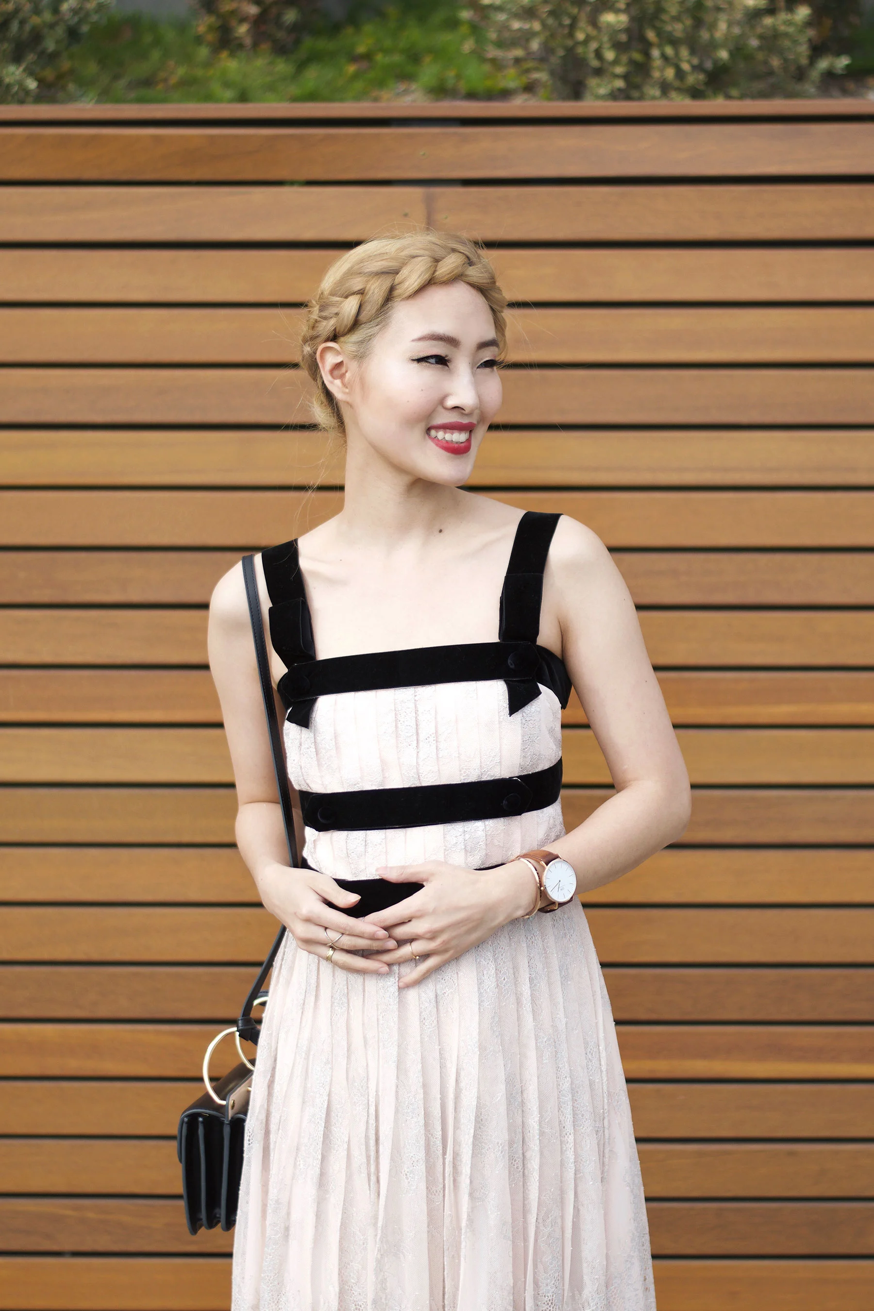 For spring wedding fashion this year, think colorful pastels, floral prints, tulle, lace, and all things feminine and flirty! For the wedding I chose to wear this velvet-trimmed lace dress by Philosophy Di Lorenzo Serafini. The midi length was perfect for the semiformal wedding, transitioning easily from the outdoor ceremony to the formal, indoor reception. To highlight the black velvet on the dress I wore black velvet sandals by Johanna Ortiz and the black Mia Shoulder Bag by Danse Lente (also worn here). If there's still some spring chill in your area, leather jackets, pretty shawls, and capelets are all fashionable options to keep warm as well.